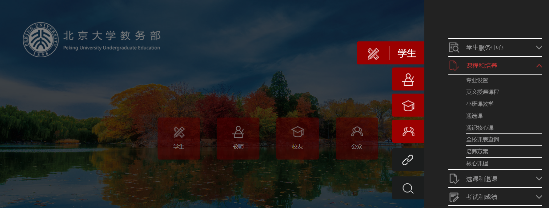 우선 북경대 교무부 홈페이지에 들어가서 学生탭을 누르고 우측 课程和培养-培养方案을 누른다.