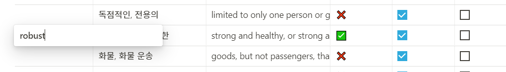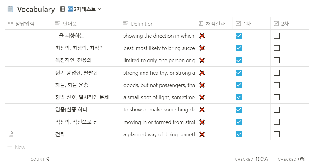 노션 단어장 템플릿입니다. 입력칸에 단어를 입력하면 자동으로 채점을 해주는 기능이 있으며, 체크박스를 통해 암기 여부를 기록할 수 있습니다.더 자세한 사용법은 제 블로그를 확인해주세요