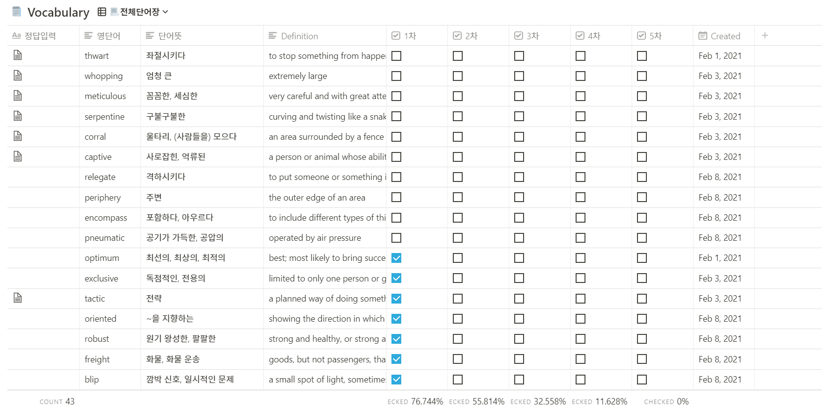 단어장 데이터베이스는 크게 정답입력, 영어단어(정답), 단어 뜻(한, 영), 1~5차 암기 기록, 추가일자 5가지 부분으로 이뤄져있다. 맨 밑부분에는 각각 회차별 암기 퍼센트가 나오는데, 원한다면 퍼센트가 아닌 암기 단어수로 변경도 가능.