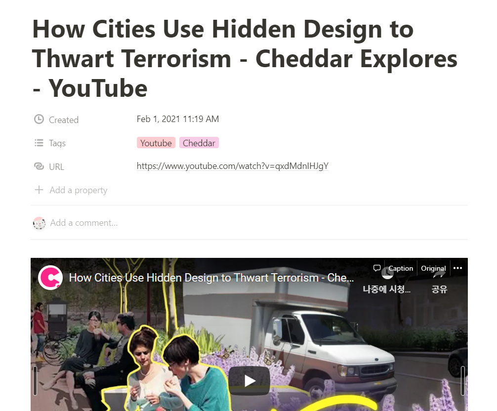 우선 유튜브에서 취미와 관련된 동영상을 찾아 Notion Web Clipper 웹브라우저 확장 프로그램을 이용하여 노션 페이지에 스크랩한다. 나는 도시공학, 도시계획이 취미라서 Cheddar라는 채널에서 올린 영상들을 즐겨보지만, 역사 채널, IT제품 리뷰 채널, 브이로그 채널 등 본인이 좋아하는 채널이면 뭐든지 괜찮다.