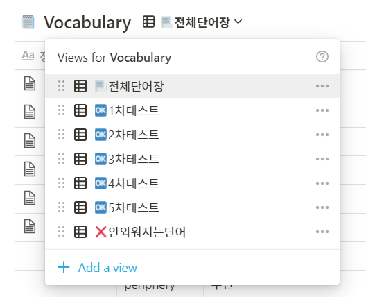 보기 부분은 전체 단어장, 1~5차 테스트, 그리고 안외워지는 단어만 따로 모아서 보는 3가지 보기 방식을 지원한다.