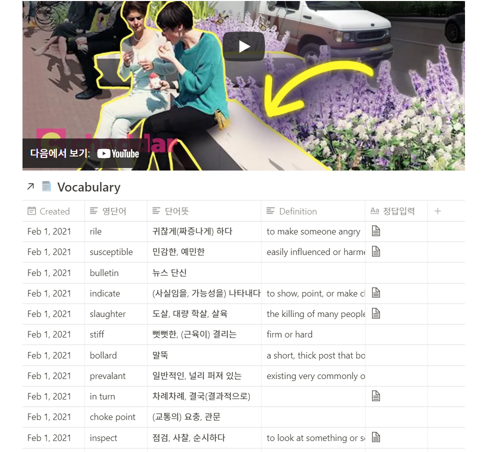 다 본 다음 영어자막을 켜고 (기본 제공 자막이 없다 하더라도, 요즘은 음질이 엄청 구리거나 억양이 엄청 구리지 않는 한 자동완성 기능을 사용하면 99%는 정확하게 나온다. 자막이 부정확하다면 그건 그냥 동영상 문제.) 모르는 단어들을 하나하나씩 하단에 있는 단어장 데이터베이스에 추가하고, 온라인 사전을 활용하여 한국어와 영어 뜻을 적어넣는다. 원한다면 하위 페이지를 만들어 예시문을 적어주는것도 나쁘지 않은 방법.