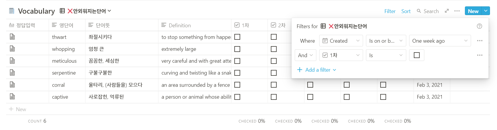 "안외워지는단어"는 추가한지 일주일이나 지났는데 아직도 1차 테스트를 통과하지 못한 단어들만 모아놓은 곳이다. 왜 하필 일주일이냐면 노션 데이터베이스의 Filter기능에 추가 가능한 날짜 필터가 특정 날짜 아니면, 하루, 일주일, 한 달이다. 일주일이 그나마 적절.