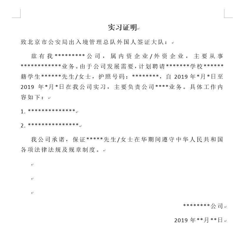 우선 인턴에 합격을 했다면 회사측에서 위 양식으로 된 (북경대 유학생사무실에서 제공한 양식이라 내용은 학교마다 다소 다를 수 있음) 회사 직인이 찍힌 인턴증명을 받아와야한다. 하지만 나는 여권을 재발급받아야 하는 관계로 새 여권이 나오고 나서야 인턴 증명서를 받을 수 있었다.