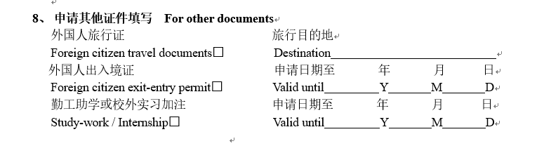 첫째는 8번 항목으로 가서 勤工助学或校外实习加注(Study-work / Internship) 항목에 체크한 다음 유효기간에 인턴 근무 만료일을 적어야 하고,