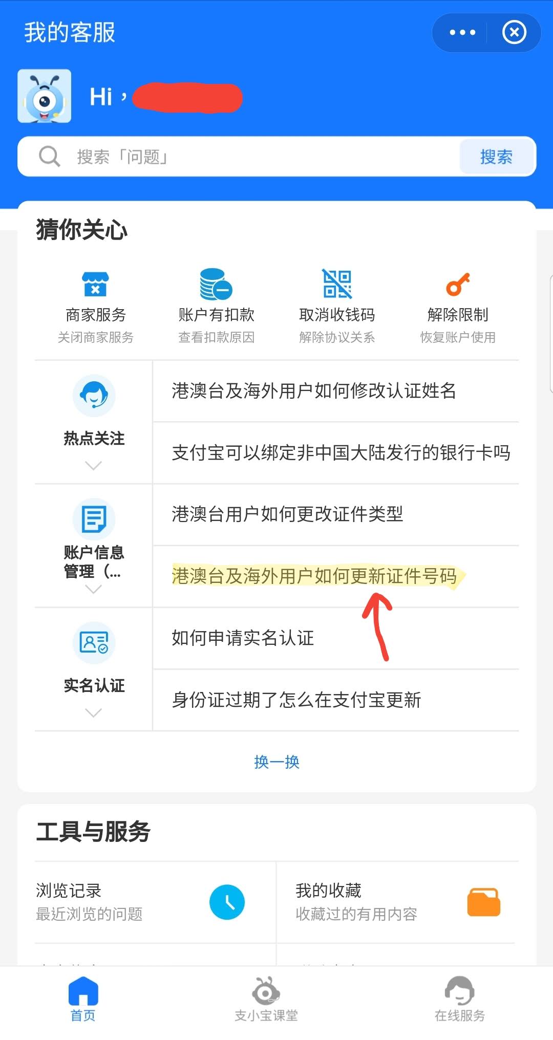 우선 알리페이. 我的-맨 밑에 我的客服를 누르면 사용자에 따라 다를 수 있지만 외국인이라면 아마 첫 화면에 바로 "港澳台及海外用户如何更新证件号码" 라는 메뉴가 보일거다. 만약 보이지 않는다면 검색창에 护照号 更新 이런 키워드로 검색하거나, 온라인 상담원을 연결하는것도 방법.