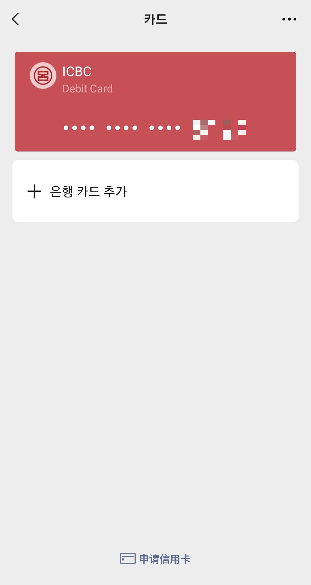 우선 위챗페이에 들어가서 기존 카드들의 연동을 모조리 해제시킨다. 이걸 미리 안하면 재가입 과정 중간에 "이미 존재하는 카드입니다"라는 경고문이 뜬 채 진행이 안되고 재가입 과정을 처음부터 다시 거쳐야하기 때문(...)