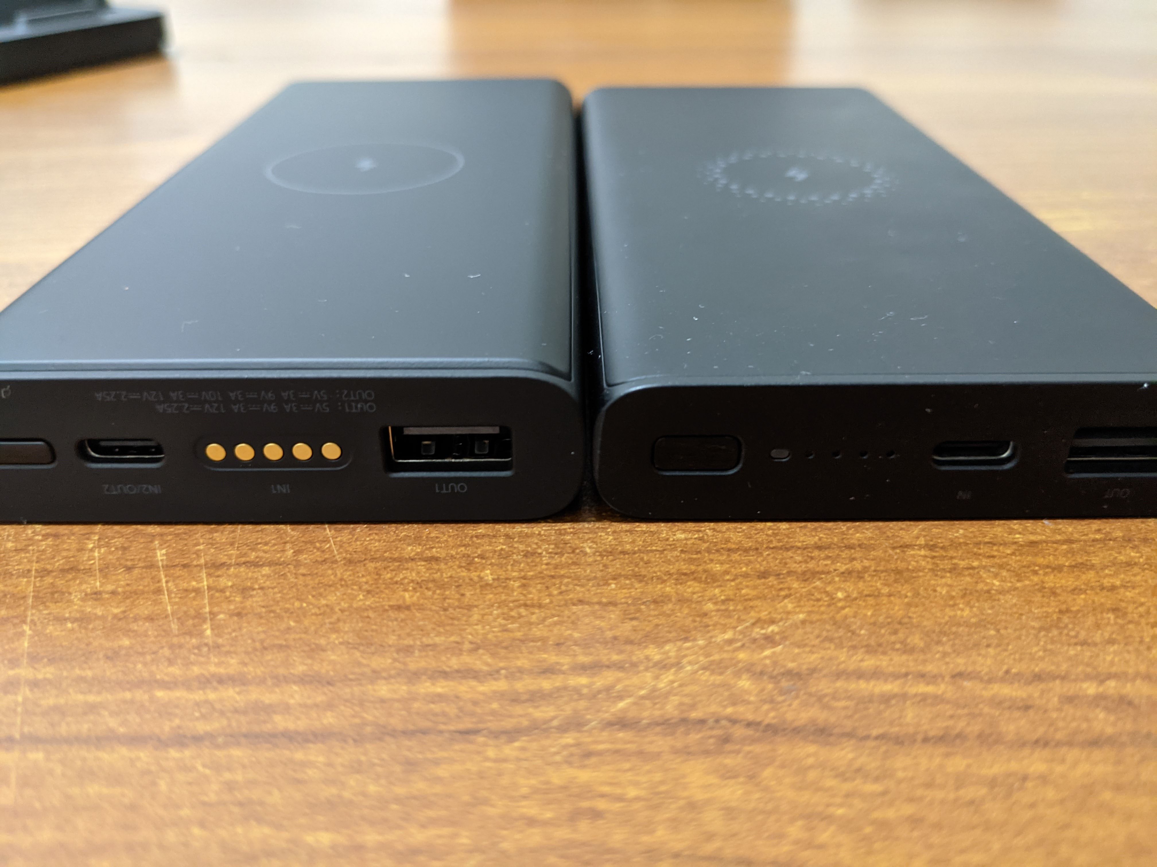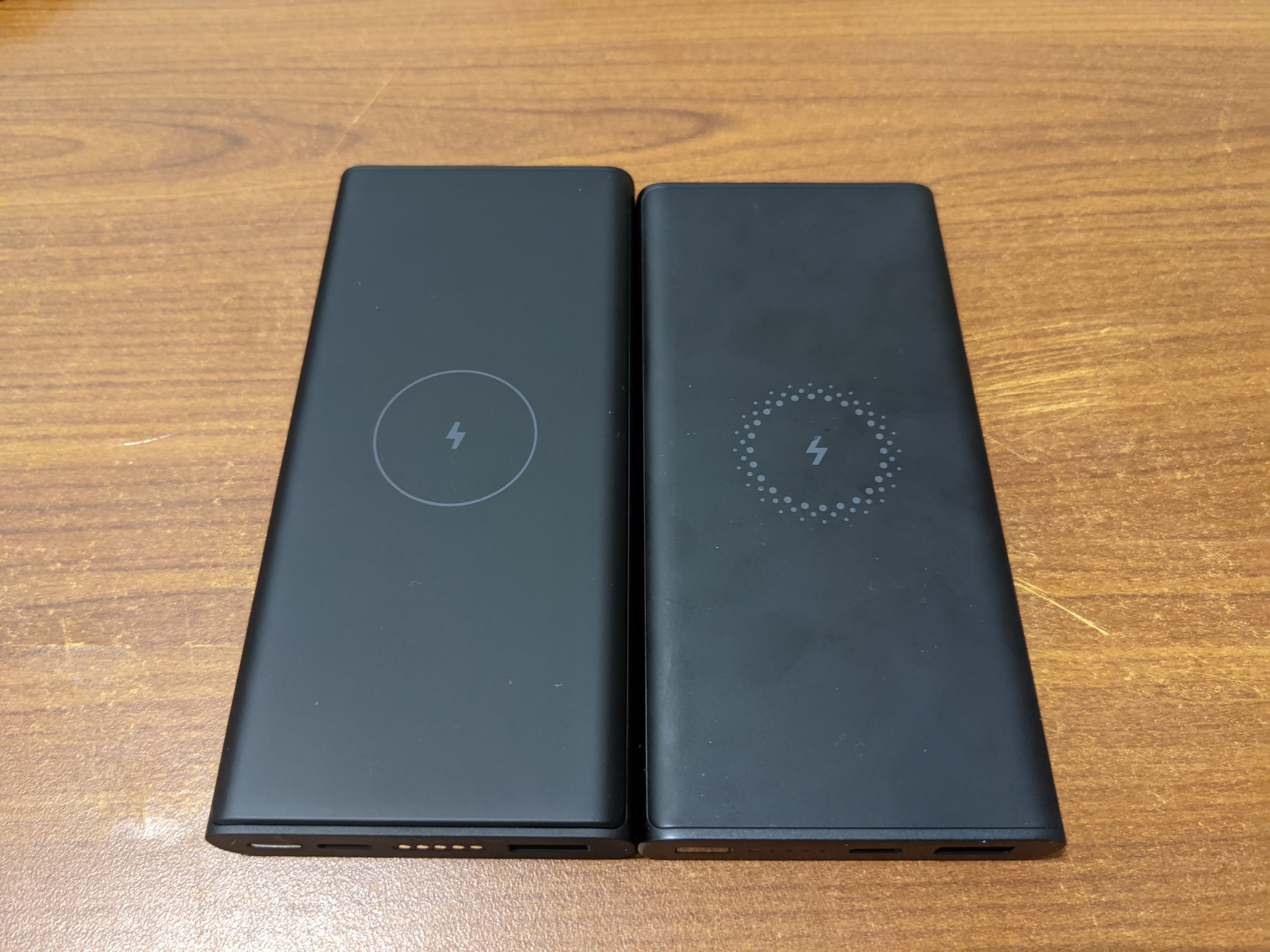 기존에 사용하던 청춘판 무선충전 보조배터리와의 비교. 무선충전 패드 디자인이 약간 다르다.