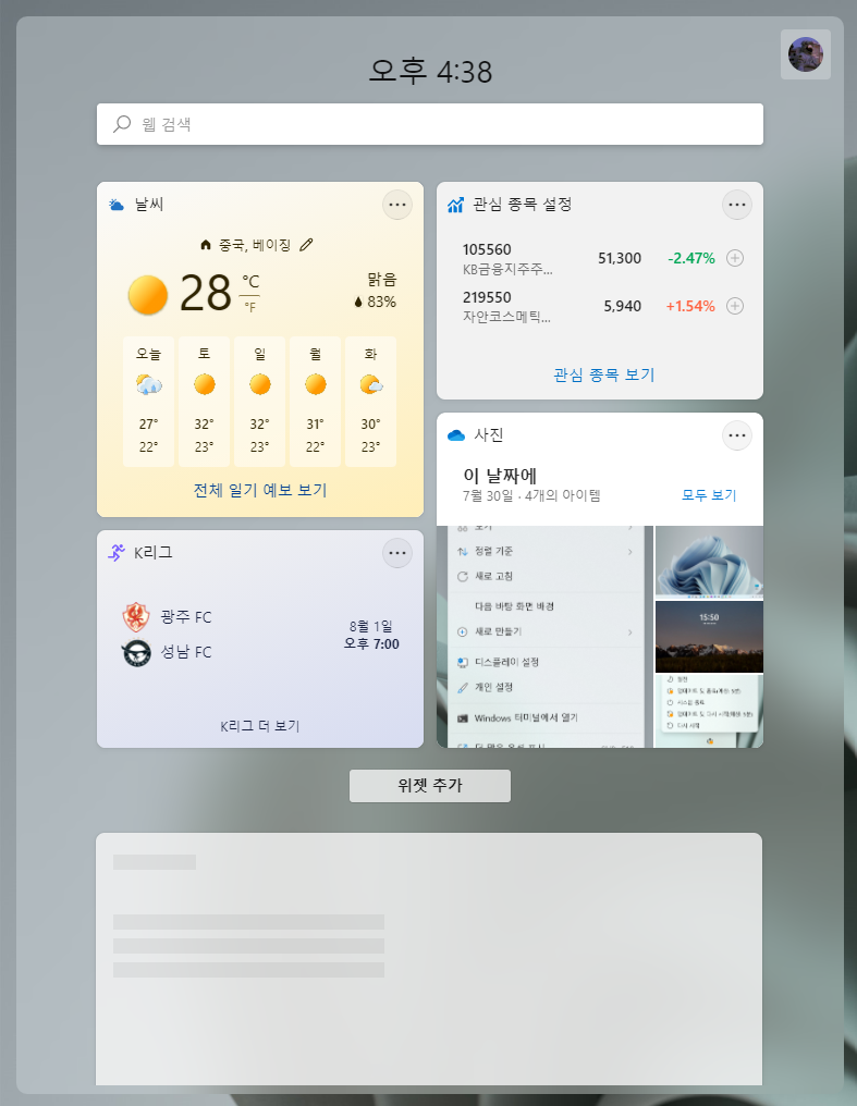 미완성판 마냥 위젯도 별로 없고 뉴스도 쓸데없이 커서 쓸 일이 없을 것 같아 아예 작업표시줄에서 비활성화 시켜버림.