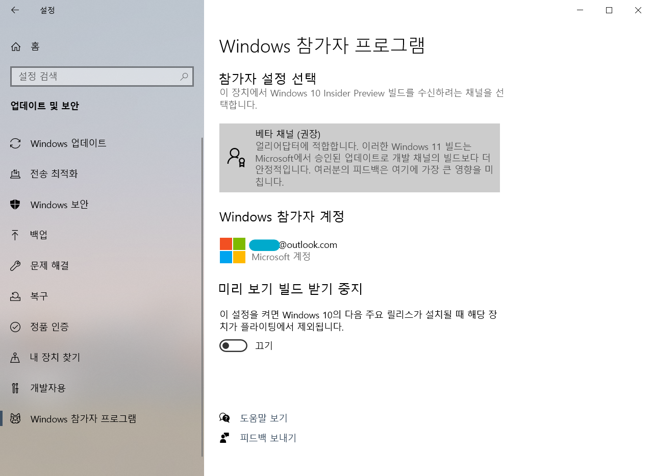 만약 아직 윈도우 참가자 프로그램에 가입하지 않았다면, 먼저 개인정보 설정에서 "선택적 진단 데이터 전송"에 동의해주고, 업데이트 및 보안 설정에서 사용중인 마이크로소프트 계정을 Windows 참가자 프로그램에 연결시켜주면 된다.
