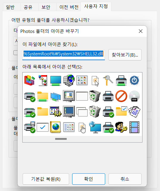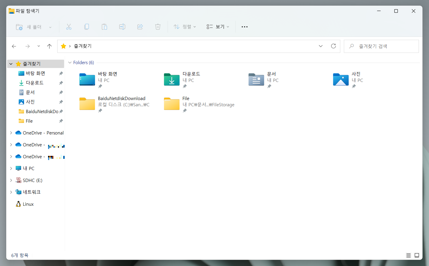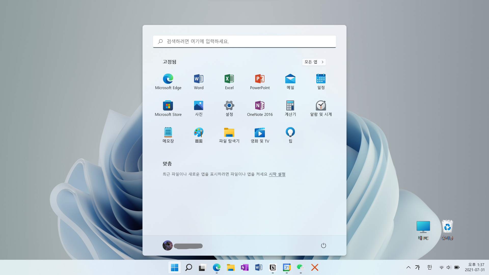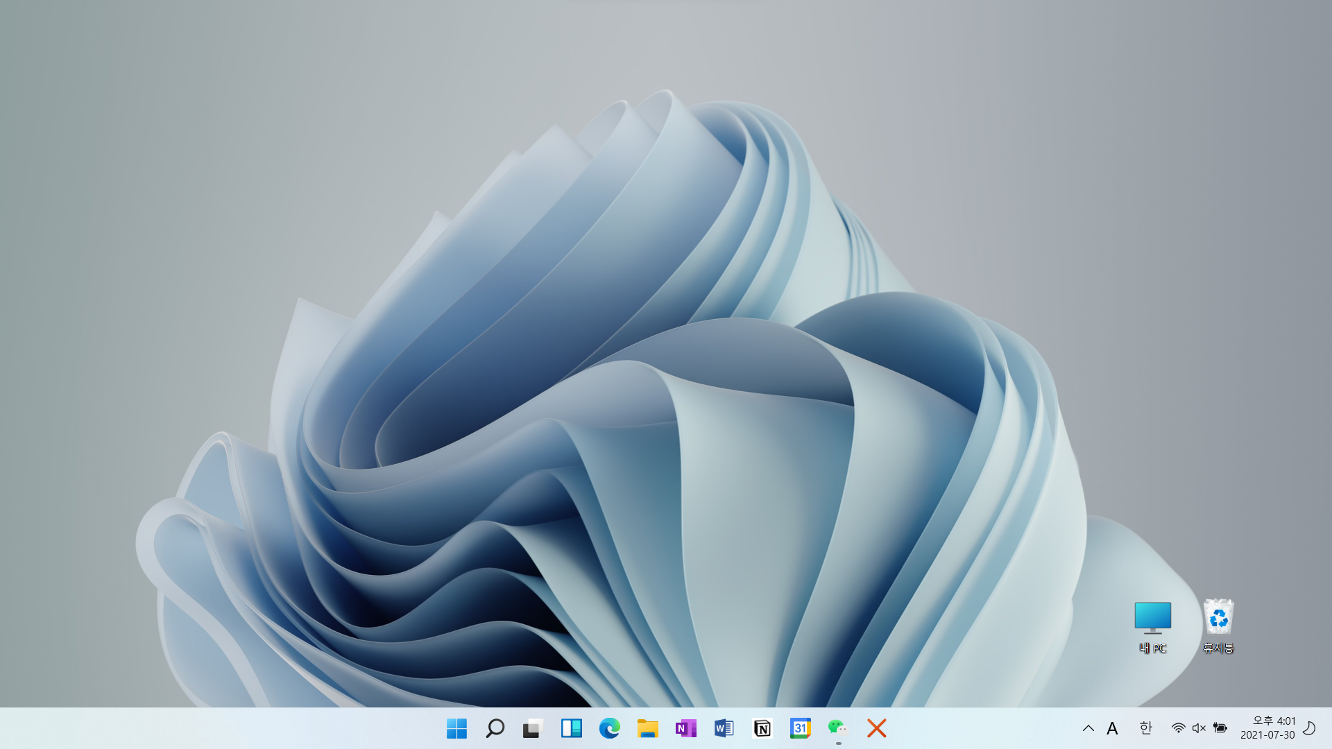 그 외에 시작 버튼(윈도우 로고), 내 PC, 휴지통 등 기존의 약간 기울어져있던 아이콘들이 전부 평면화되었다. 솔직히 아이콘은 윈도우10때가 더 마음에 들었는데.